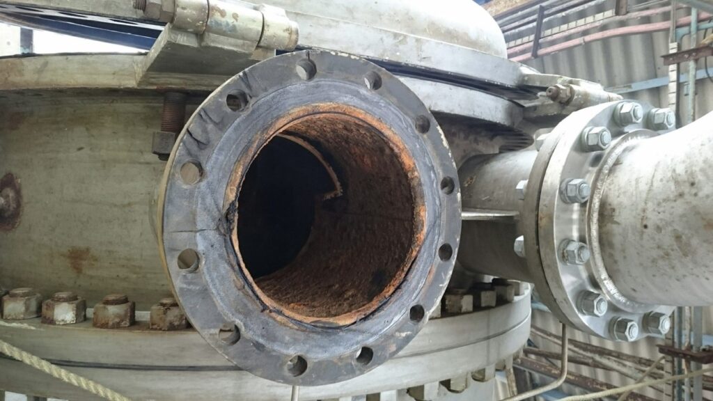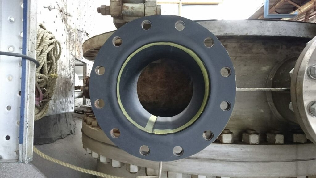 こうしたフランジ部に対し、ゴムライニングによる防食施工を行っています。